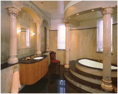 Dieses exzellente Bad, bereits mit Marmor und Granit komplett ausgebaut, sollten wir mit einer dezenten "alten" Waldmalerei - Thema: Stillleben mit Früchten und oberhalb der Säulen mit kleinen Putten - ergänzen. Wir ließen die Wände mit Kalk- Zement-Putz verputzen. Somit konnten wir die Malerei mit Silikatfarben ausführen. Diese Farben sind für solche Wandmalereien besonders geeignet: Gegen Luftfeuchtigkeit unempfindlich - sie verbinden sich chemisch mit dem Untergrund - und sie ergeben eine sehr schöne, H unauffällige, in sich farblich stimmige Oberfläche.